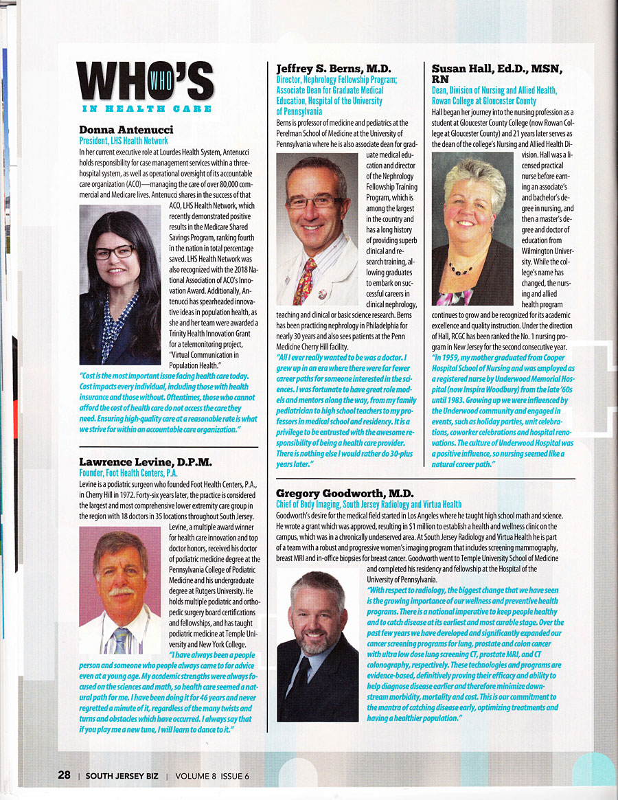 Podiatrists are not typically singled out for awards. Until more recently, they weren’t even considered part of the mainstream medical community. ImPRessions’ has helped Dr. Lawrence Levine of Foot Health Centers, LLC, receive repeated honors, including inclusion in the 2018 list of Who’s Who in Health Care in South Jersey Biz Magazine, among only 20 winners. Other honors have included a Philadelphia Business Journal and United Healthcare Innovation Award, NJ Biz Magazine Healthcare Hero Award and repeated Top Doc honors in Philadelphia and New Jersey media.